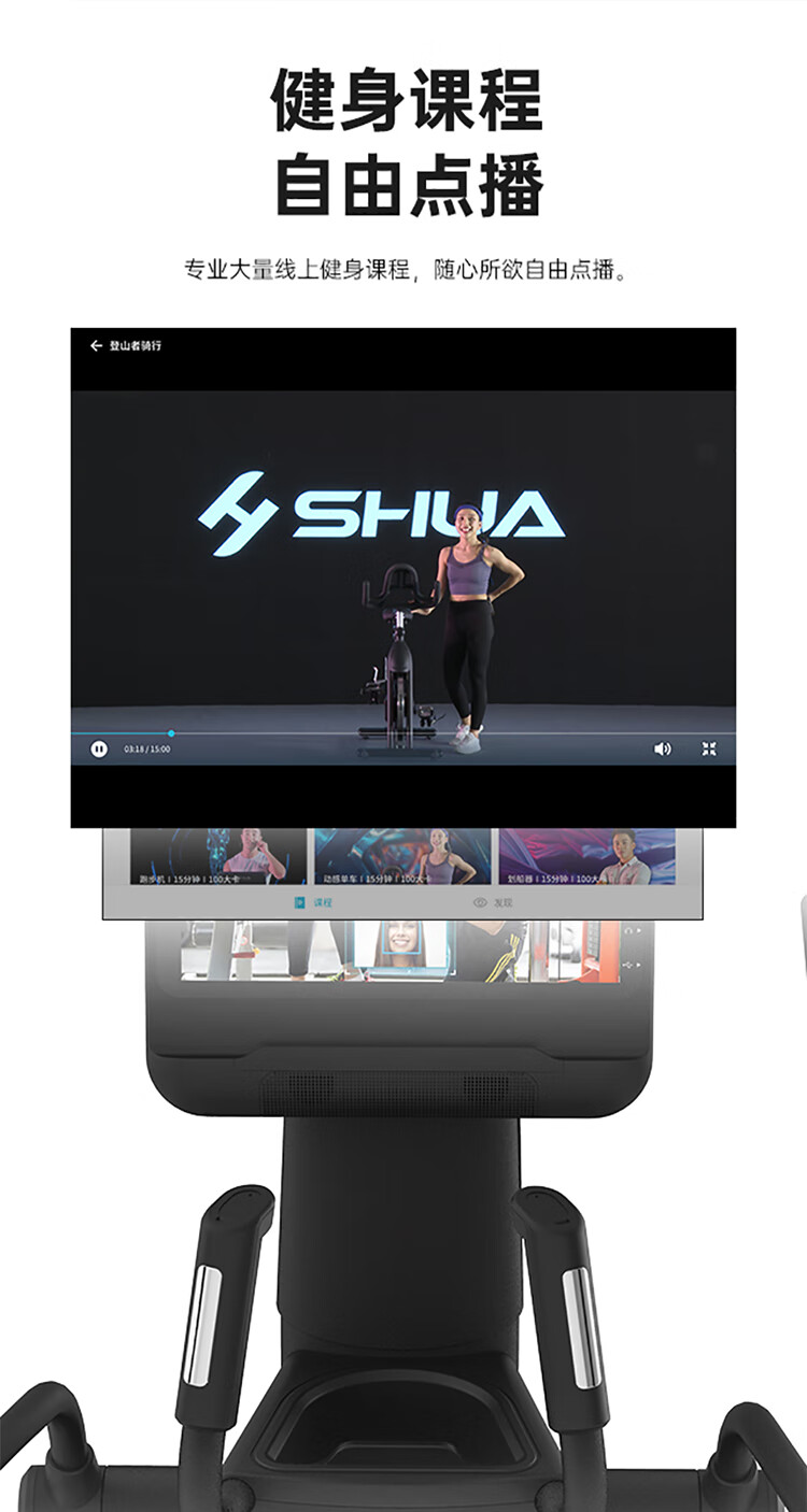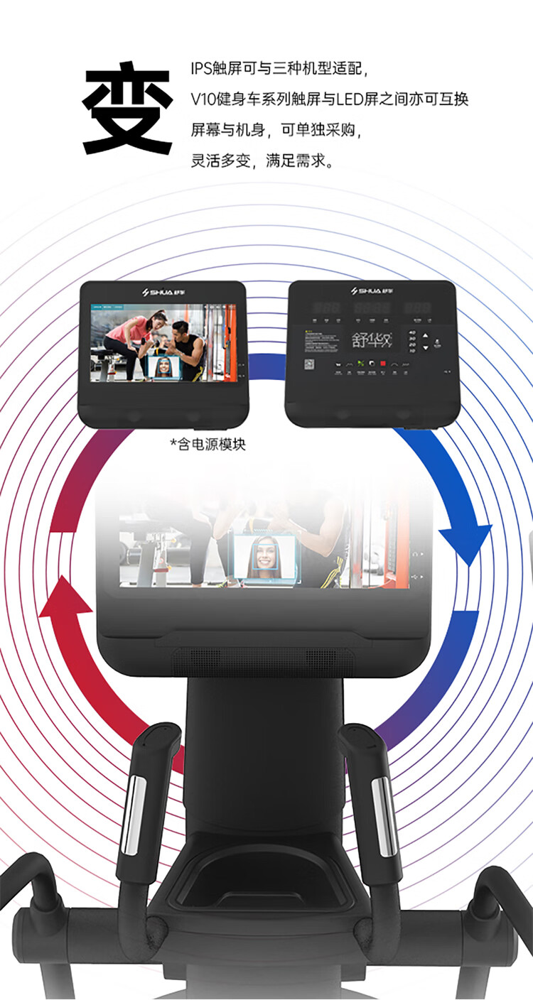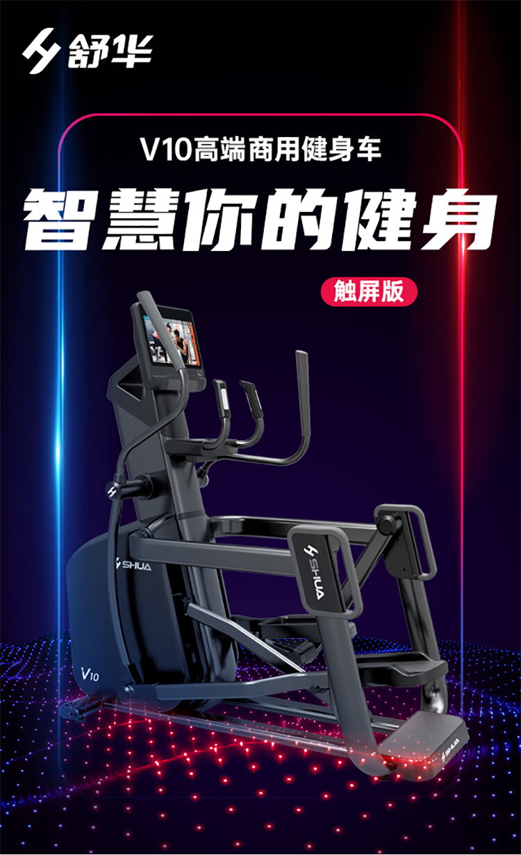 舒華立式商用健身車SH-B9100U(V10)觸屏版擁有超大顯示和操作屏幕, 可以任意設置阻力、時間和距離等參數,還可以即時顯示心跳和轉速等數據,同時,SH-B9100U提供多項科學運動處方,更輕松掌握運動節奏。