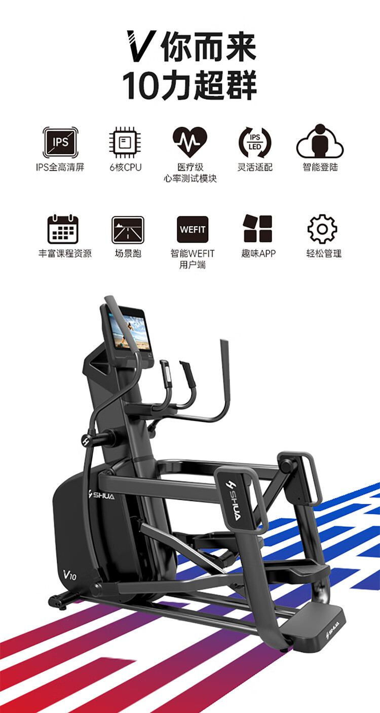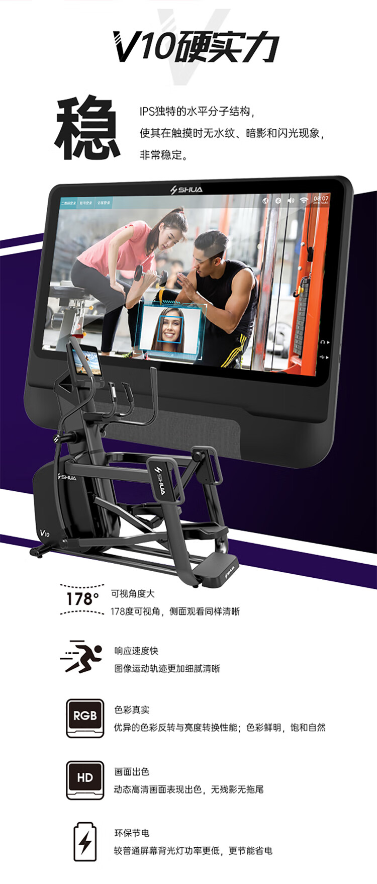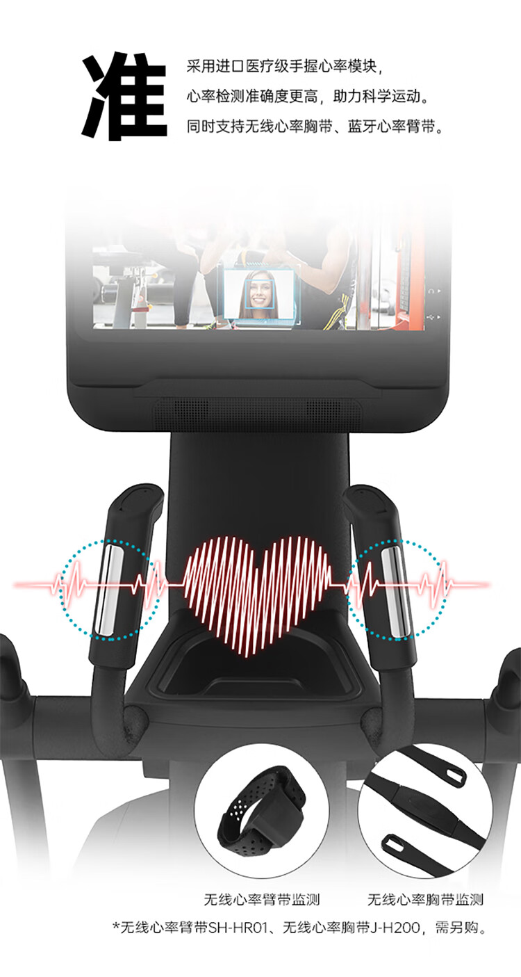 舒華立式商用健身車SH-B9100U(V10)觸屏版擁有超大顯示和操作屏幕, 可以任意設置阻力、時間和距離等參數,還可以即時顯示心跳和轉速等數據,同時,SH-B9100U提供多項科學運動處方,更輕松掌握運動節奏。